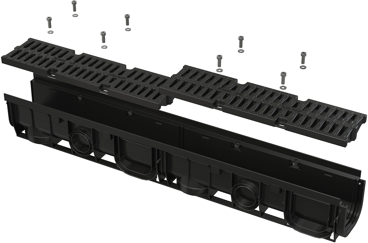 • Plastmasas režģis - piestiprināts kanāla korpusā ar astoņām nerūsējošā tērauda skrūvēm, spraugu platums - 14 mm