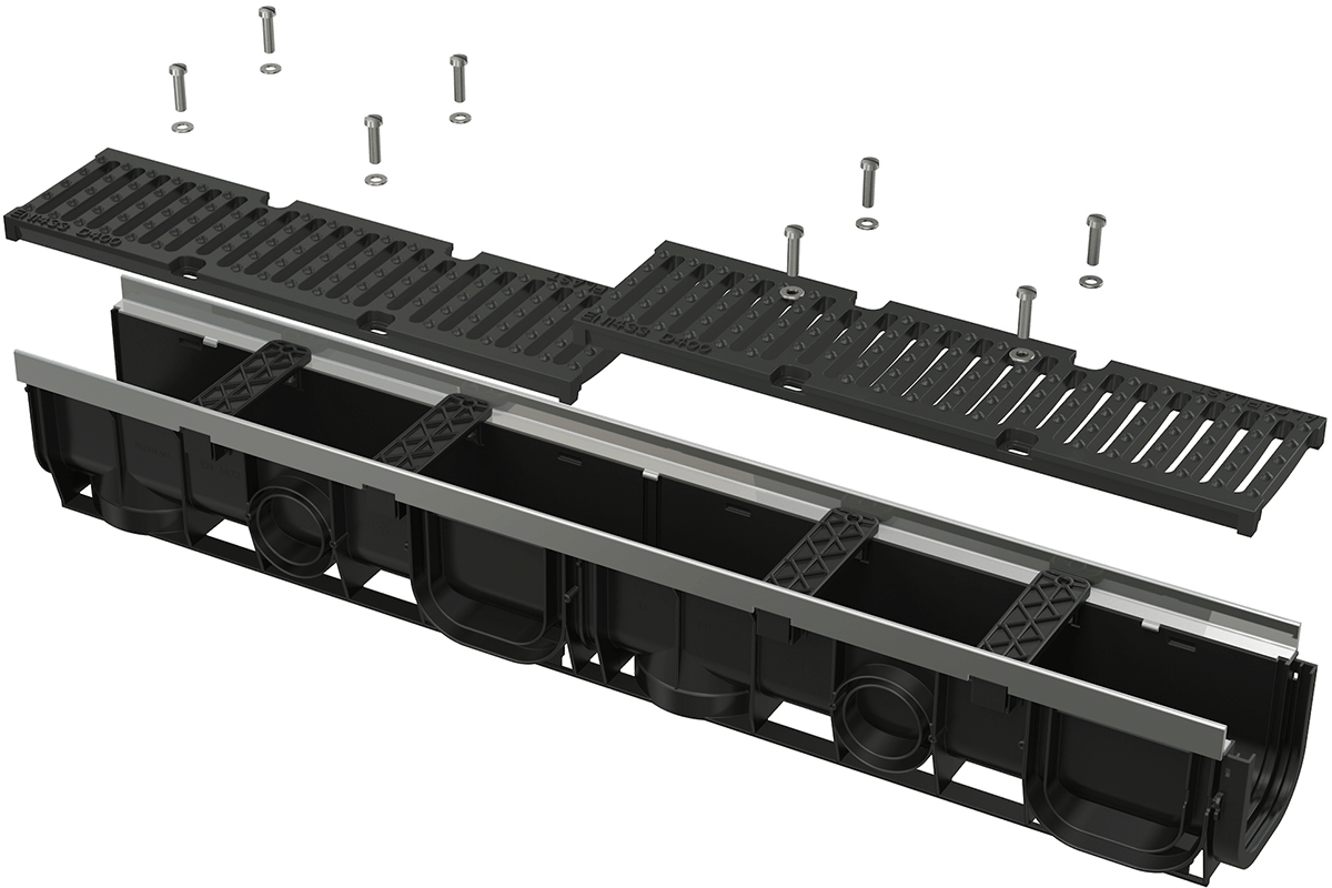 - Čuguna režģis - piestiprināts kanāla korpusā ar astoņām nerūsējošā tērauda skrūvēm, spraugu platums ir 11,6 mm