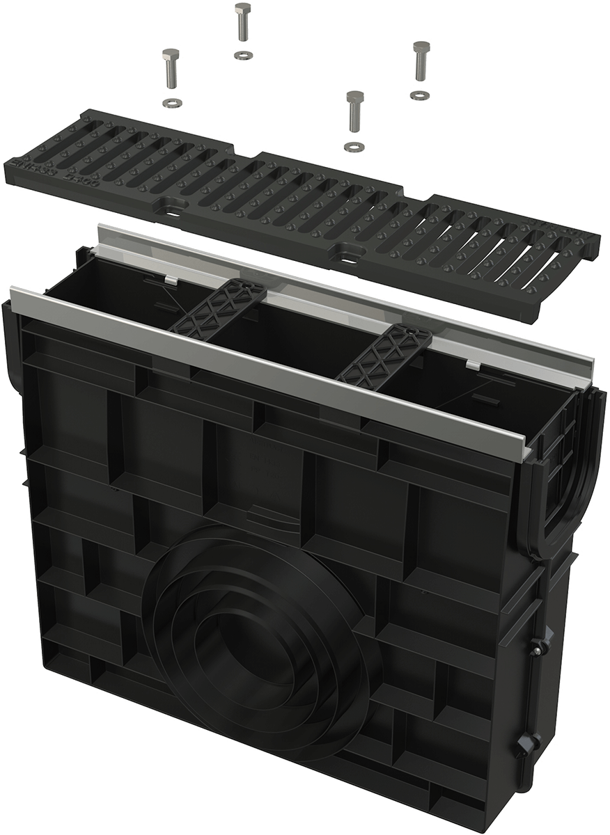 - Čuguna režģis - piestiprināts kanāla korpusā ar četrām nerūsējošā tērauda skrūvēm, spraugu platums ir 11,6 mm