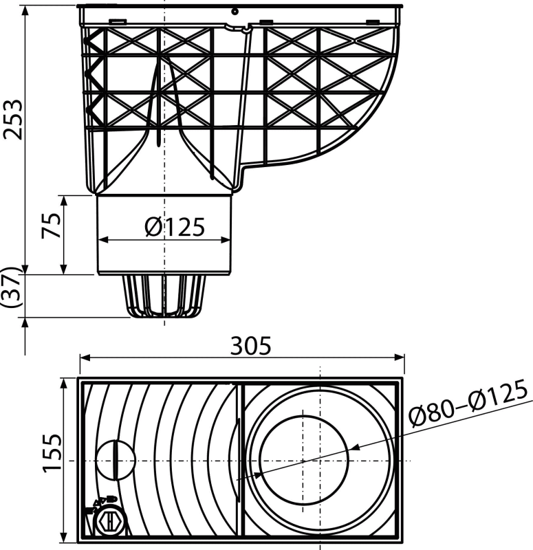 - Trapa korpuss ar vertikālu izvadu Ø125 mm
