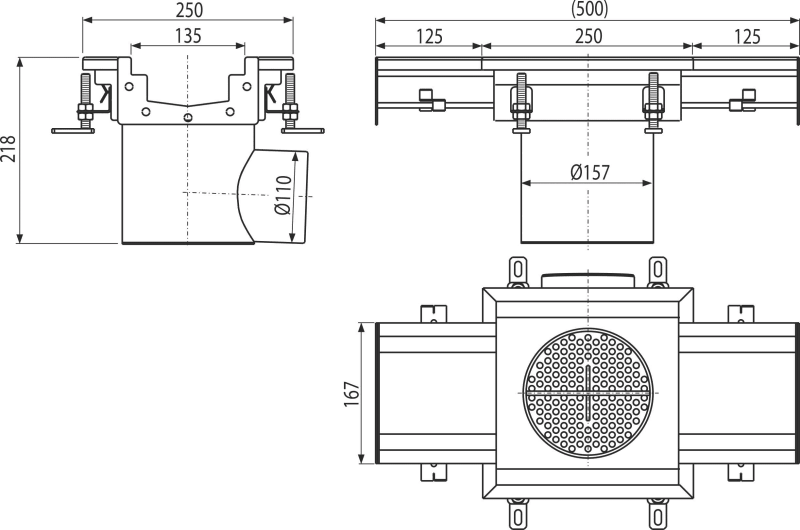 Rūpnieciskais traps 250 x 250 - 135 no nerūsējošā tērauda AISI 304, ar kārbveida izvadiem