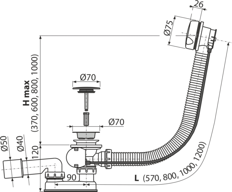 - Sifona hidroaizvars no polipropilēna, metināts ar ultraskaņu, izturīgs pret termiskām un ķīmiskām ietekmēm