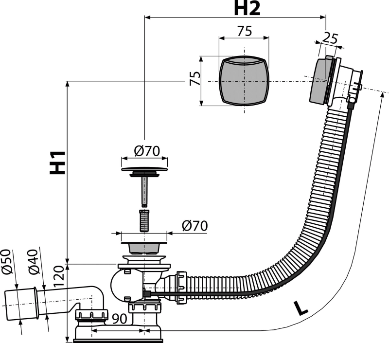 - Sifona hidroaizvars no polipropilēna, metināts ar ultraskaņu, izturīgs pret termiskām un ķīmiskām ietekmēm